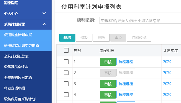 使用系统,医院各科室可以在线申报采购计划;设备科可以将各科室的年度采购计划按月度、报价进行分类管理;设备科可以根据科室采购计划快速生成生成招标公示进行线上招标,让企业在线投标、线上开标评标等等。