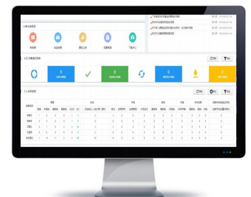 包括不限于科研大数据分析、科室科技影响力、人员科技术影响力、科题,论文、专利、奖项、著作、科研平台、任职等。