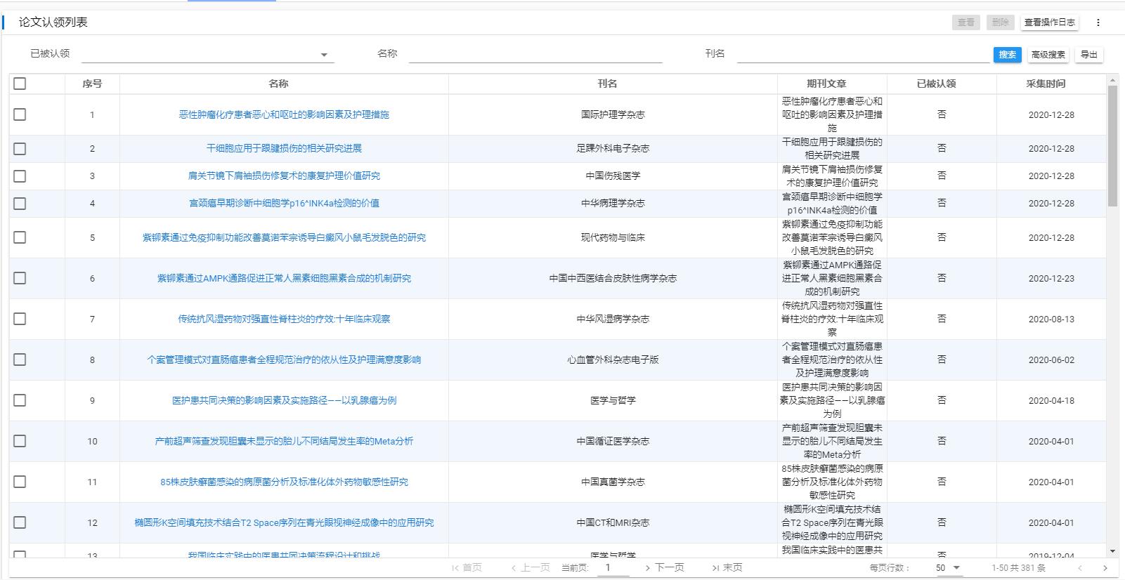 本系统可以访问学术网站,每周自动联网采集论文数据,汇总采集到的所有论文数、新增论文数、更新论文数、需求认领数。本系统全自动下载该院发布的第一机构署名为该院的中文文章。文章下载后自动对于该院作者,由作者完善论文信息,如果出现重名,则需人为判断归属作者,在论文认领模块,列出需要判断归属作者的文章,手动选择作者。
