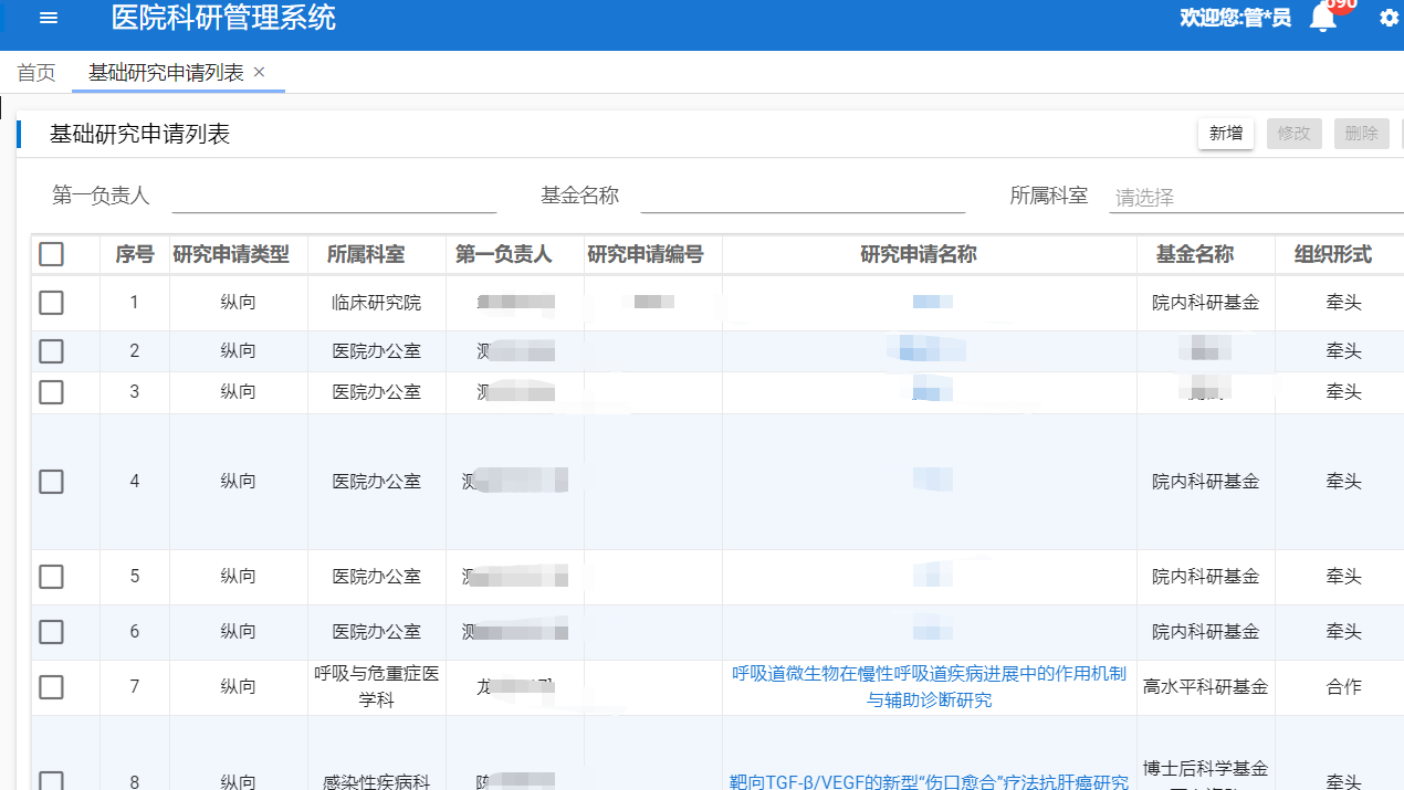科研课题板块从申请开始到结题验收的全过程都能在系统上查看,能够详细记录课题、课题组成员基本信息;专家评审意见、课题延伸成果(论文、专利);课题阶段进展报告、结题报告等各种材料;科研经费预算、支出、结余等使用情况;个人科研成果奖惩情况,能够为医院科研课题从建立到结题的全过程形成信息化管理。