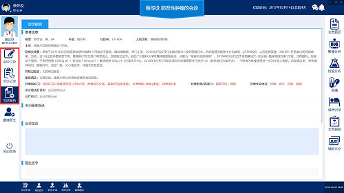 系统记录了本次住院病程和当前疾病全息病程记录,并且可显示多次住院病程详情,可选择时间段查看病程详情。系统罗列了多种影像类型查看,并且可以看到当前疾病检验结果和异常指标分析。全息医嘱中可以看到本次诊疗医嘱,医嘱分析、用药医嘱,膳食医嘱,其他治疗医嘱,分不同时间段各时间段以时间线形式显示。