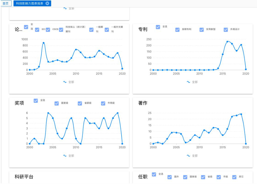 系统跨维度支持个人、科室、科研科题、论文、专利、奖项、著作、科研平台、任职等。任意时间生成各种任意个性化数据报表,包括不限于 柱状图、饼图,EXCEL等。