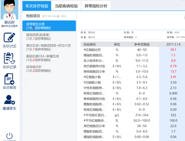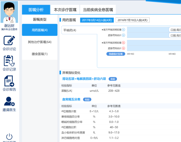 统计和记录患者现病史、药物过敏史、家族病史、异常指标、异常影像/病理、异常生命体征、会诊理由及目的、诊疗经过。可以查询到会诊记录,会诊的结论和会诊的报告,方便参加会诊的医生了解病患者信息,提供专家意见。